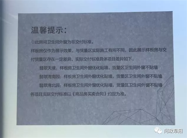 三,精装修质量问题,经过询问业主们装修价格都是在1500元一平方,有的甚至是1600,1700。装修费用的标准难道不同?收费差异如此大。算下来,一套房子一二十万的装修费,最后碧桂园却给我们业主装出四五万的效果,真是吸老百姓的血,活生生把我们业主吸死啊!与碧桂园协商,碧桂园翡翠湾方面领导直言不讳的告诉我们,窗户我就给你用普通铝(不用样板房展示的断桥铝),你能怎么办。其他装修材料也与销售时对我们承诺的名牌材料,被神奇的掉包成了地摊货。