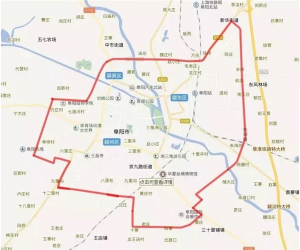 阜阳市禁止燃放烟花爆竹区域:“人民西路—南京路—古泉路—颍东路—S305 阜蚌路—东环路—纬三路—经六路—G105—经八路—经二路—润河路—南京路—机场路—学苑路南延线(一道河路至机场路)—学苑路—人民西路。”所合围区域。