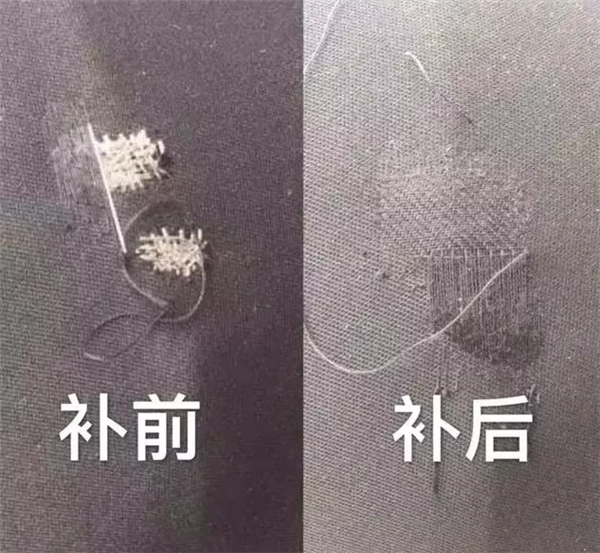 这辆奔驰G350 BlueTEC敞篷版车篷的具体破损位置,位于左侧敞篷顶角处。董怀利事先配好了3、4种粗细不同的黑线带来,在研究过这款车敞篷布料的纹路之后,母子二人要根据布料本来的经纬线,一根根来回补上去。织补完成后,车主韩先生非常满意。